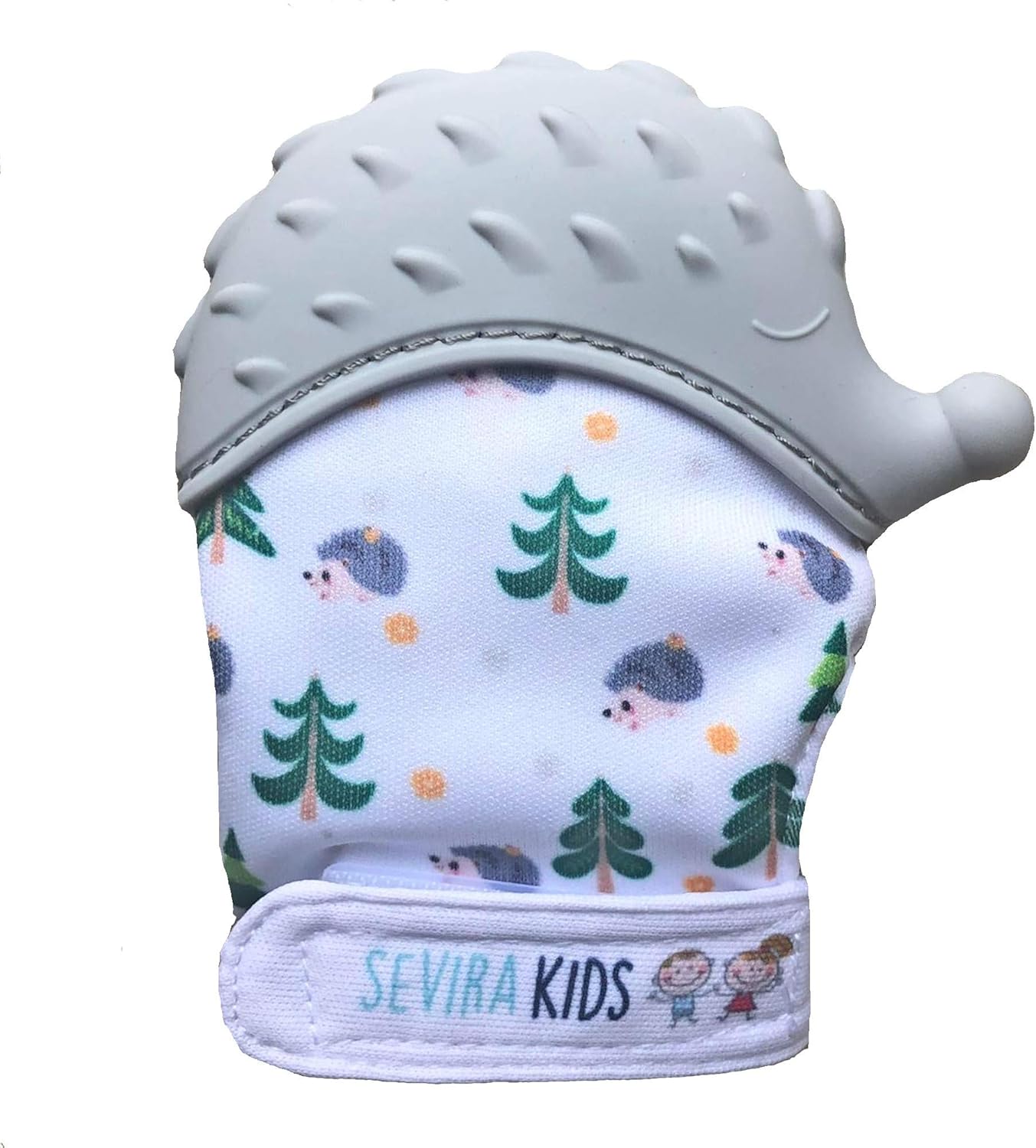 Sevira Kids - Moufle de dentition - Bebe - Silicone Alimentaire - Protège Mains - Apaise Gencives - Lavable en taquine - Cadeau Naissance - Imprimé Hérisson - Gris
