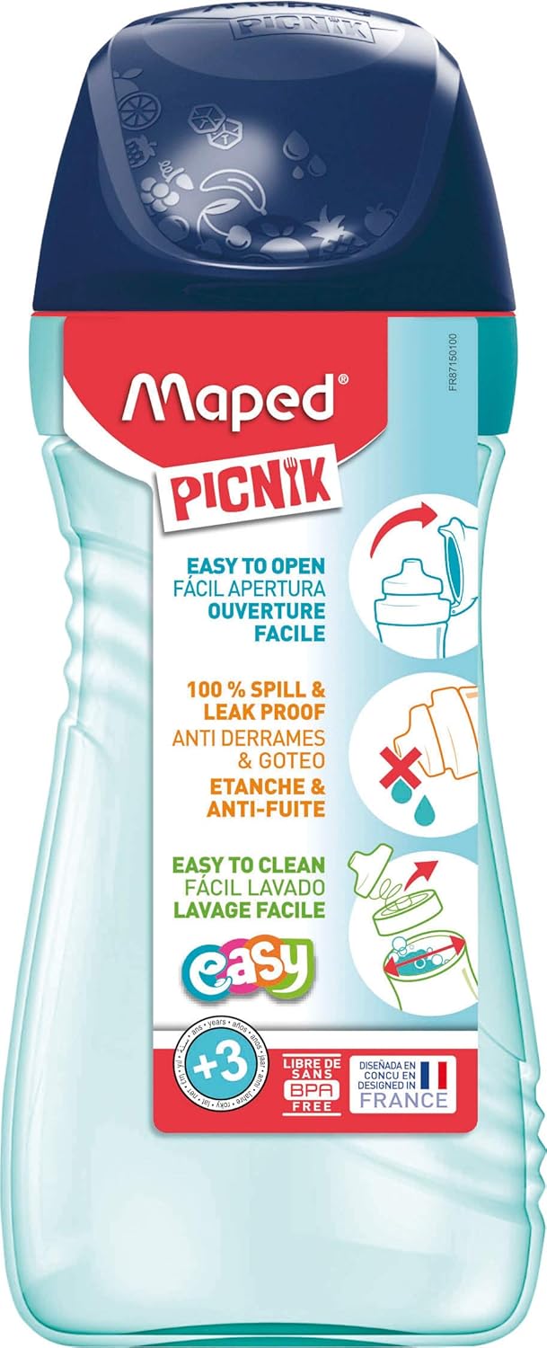 Maped Picnik, une collection de boîtes à déjeuner, bouteilles d'eau et sacs à déjeuner inspirés par les enfants et leurs parents. La petite gourde Origins de 430ml est facile à ouvrir, il suffit de soulever le capuchon avec son pouce. Le capuchon protège le goulot pour qu'il reste propre. Etroite en haut, elle est facile à tenir par des petites mains. Pour boire, il suffit d'appuyer avec sa bouche autour du goulot ou avec un doigt. Parfaitement étanche et anti-fuite, le goulot au système breveté se referme automatiquement lorsque l'on a fini de boire. Le corps transparent permet de voir en un coup d'oeil le niveau de liquide à l'intérieur. La gourde peut se nettoyer au lave-vaisselle. Le goulot est démontable, pour cela appuyez dessus et faites le tourner dans le sens des aiguilles d'une montre, puis soulevez le. La bouteille d'eau est en plastique garanti sans BPA et sans Phtalates. Tous nos produits sont certifiés contact alimentaire. La bouteille est utilisable avec de l'eau, du sirop ou des jus de fruits, mais pas avec des boissons gazeuses. Pratique à utiliser partout, pour l'école, les sorties scolaires, les activités sportives, mais aussi à la maison pour s'hydrater la nuit sans risque de mettre de l'eau dans son lit. Equiper votre enfant d'une gourde pour l'école, c'est favoriser son hydratation tout au long de la journée, ce qui lui permettra de se sentir mieux et d'être plus concentré sur ses leçons. C'est aussi faire un geste pour l'environment puisque la gourde est réutilisable au quotidien.