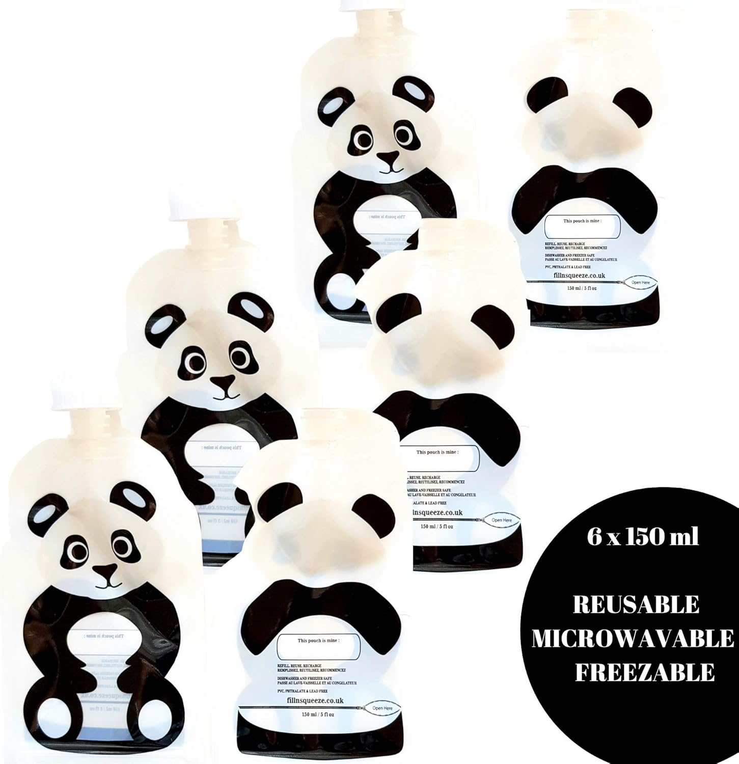 Fill n Squeeze le sac d’ouverture du fond réutilisable pour faciliter le nettoyage. 6x150 ml sachets (Panda)